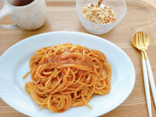 休日の昼ごはんは毎回悩んでいたから、パスタを食べると決めたら考えなくていいから楽になったけど、連続でミートソース食べたらちょっと飽きてきた…。
